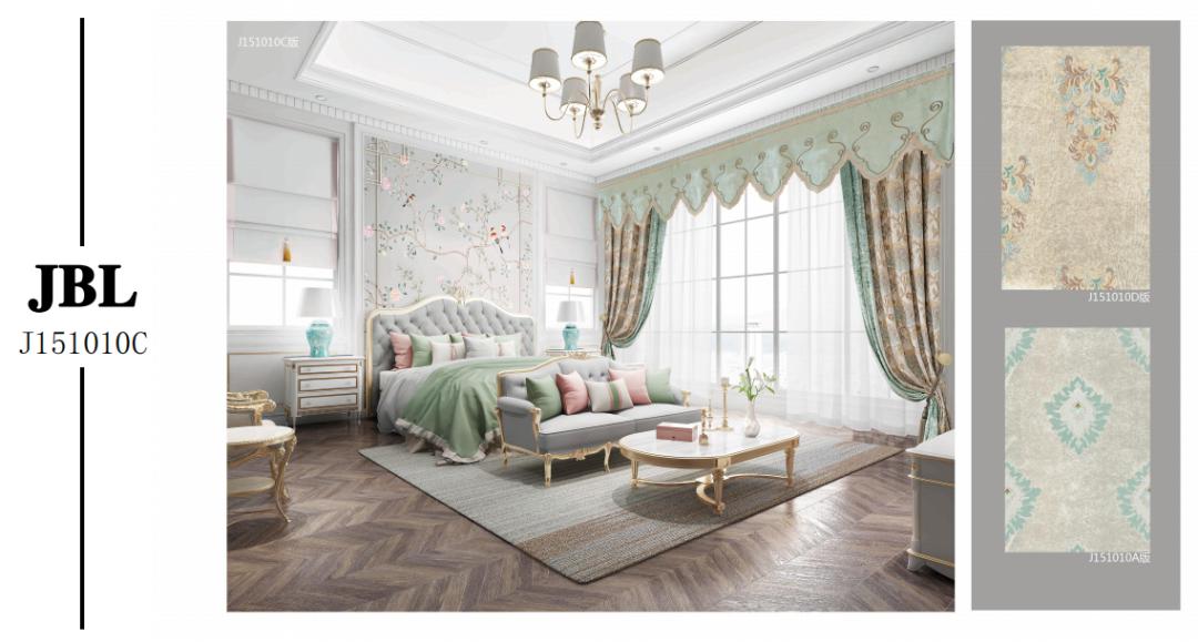 优雅复古的绿,精致的花边,为空间营造出华丽而典雅的氛围,自然流露出华贵优雅的气质,简约的水波,精美而不繁琐,底布手绘渐变,整体画面呈碎金效果,影影绰绰,演绎低调的奢华,用现代时尚工艺诠释复古的经典。