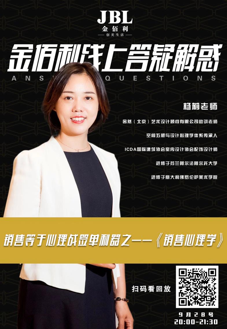 营销与销售必须知道的心理学 销售利器 销售等于心理战签单利器之 《销售心理学》 135分割线 9月28日晚20:00金佰利直播间 杨莉老师与武云霞老师 为您答疑解惑! ▲ 舍然软装讲师 本次的直播内容是对于上一期即 9月16日 晚的直播内容 《自然进店的客户越来越少,如何留住客户,如何提高客单值?》 进行深入探讨。 根据这些问题,让您足不出户也能在金佰利的直播间帮您在实际签单过程中遇到的所有问题通过本次的直播都将为您一一解答。 关于销售心理学 我们实际签单中用色彩营销心理学来提高签单率。 色彩有三属性, ...